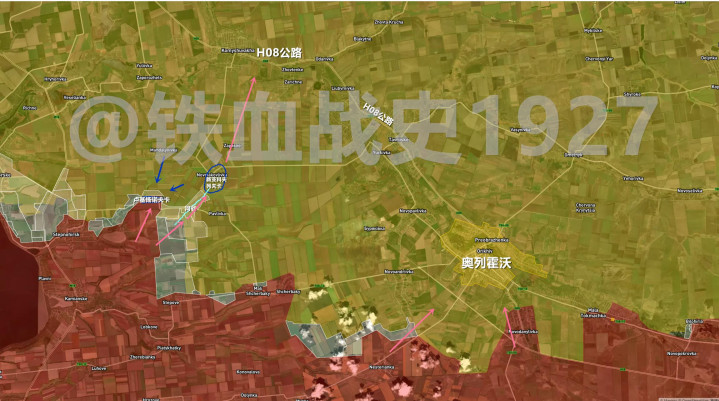 在奥列霍沃方向,俄军在拿下卢基扬诺夫卡后,乌军向这里增派了一些部队,原想将俄军堵在该村郊区,但没想到,俄军选择绕过该村东侧的乌军阵地,从更东部的一条干河谷突破了乌军防线,然后俄军沿着这条干河谷攻占了乌军数个据点,一直攻到新亚科夫列夫卡村西南郊区。随之,围绕这个重要定居点的战斗立刻展开了。夺占这里对未来的奥列霍沃之战至关重要。这个村距奥列霍沃的主要后勤线H08公路只有8公里出头,而且这个村位于一个制高点上,非常适合充当俄军的无人机阵地,这意味着拿下这里后,奥列霍沃的补给线将处于俄无人机和火炮的打击之下,俄军可以用火力将其切断,最终可以助力俄军攻占奥列霍沃。