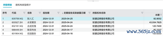 Wind数据显示,截至2024年,财通证券持有财人汇(835759.NQ)、 永安期货(600927.SH )、 联芸科技(688449.SH)、优创股份(831904.NQ)、 永成双海(832181.NQ)等股票。