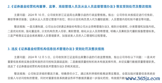 针对该项处罚,财通证券已在年报中披露整改措施,一是完善制度,出台《财通证券从业资格管理办法》,做到分级授权、分类管理和加强内控;二是优化机制,强化董监高、分支机构负责人任职、离职管理等;三是严格落实证监会系统离职人员管理要求,加强该类人员的入口管理和过程管理。